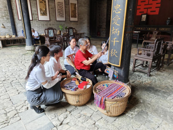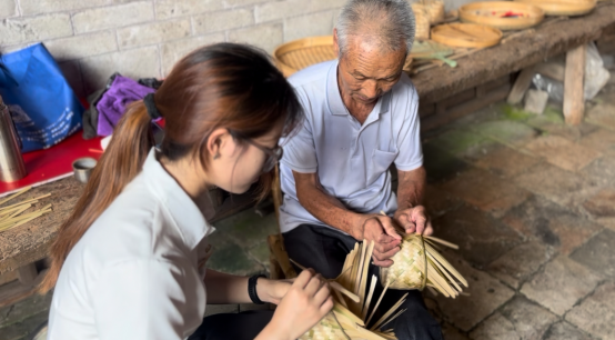 实践团队先后参与织锦、竹编制两项省级非遗项目实践。织锦传承人演示了"挑经显纬"的传统技艺,实践团队员们亲手操作木质织机,在经纬交织中感受客家服饰纹样的吉祥寓意;竹编制现场,老匠人传授"选料、剖篾、刮青、编织等工序,实践团队员们尝试编结提篮、箩筐、背篓、等生活用品,体悟"变竹为器"的匠人精神。"非遗技艺不仅是手艺,更是客家人与自然和谐共处的生活哲学,我们有责任做好传承者。"
