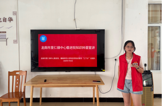 7月5日,赣南师范大学科技学院经济管理系"三下乡"实践团队走进龙南市里仁镇,在龙南市里仁镇中心敬老院开展电信防诈宣讲、健康知识科普、内务整理、互动游戏等志愿活动。这是该系继关爱乡村儿童、拜访抗美援朝老兵后,暑期"三下乡"实践的又一暖心行动。