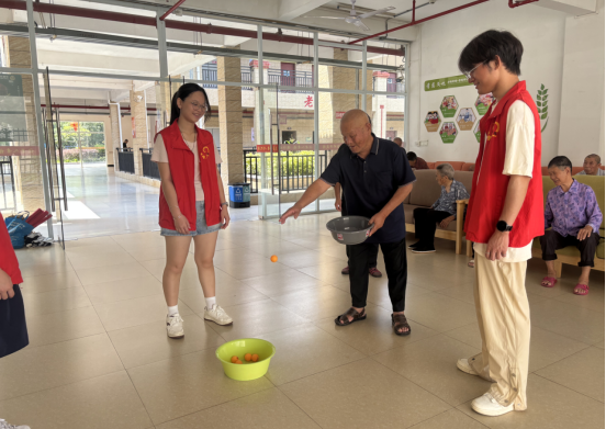 知识科普宣讲后,实践团组织了适老化的“乒乓投桶”趣味游戏,志愿者们贴心选用轻质乒乓球并放置桶具于合适距离,老人们参与热情高涨,82岁的王奶奶精准投球赢得喝彩。