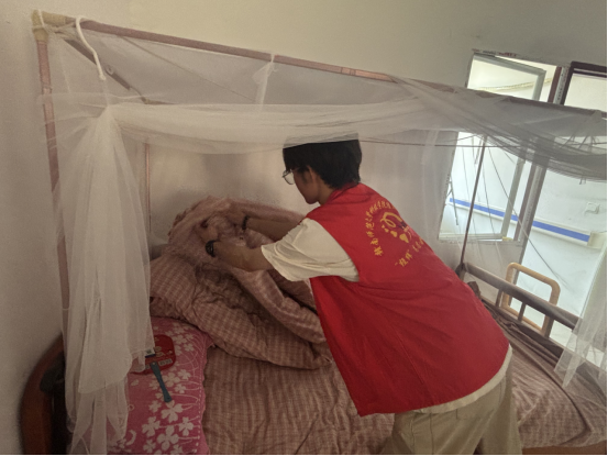 游戏后,实践团深入老人居室提供贴心服务:清洁地面、整理床铺、叠放被褥。打扫过程中,同学们一边劳动一边与老人亲切聊天,关切询问日常生活和身体状况。简单的房间整理,传递了真挚关怀,让老人们感受到温暖陪伴。